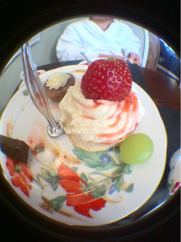 Robed up and ready we headed away from the bubbles towards our 4pm date with the ‘kitchen’ – not a place for us to lift a finger, you understand, nor worry about washing up mind you, no, a very sweet, spa-yet-homely style kitchen-dining area where we were catered for beautifully and chatted with happily at the hands of the scone-making-Chantilly-cream-supreme-chef Pat, (*waves*) and his adorable comrade Mitch; who was doing an incredible job of waiting on our quite serious hunger and thirst (despite his being able to empathise thoroughly with our hangover situation after his previous nights football viewing a la pub…a “good night” even if he wasn’t able to tell me the score…!)